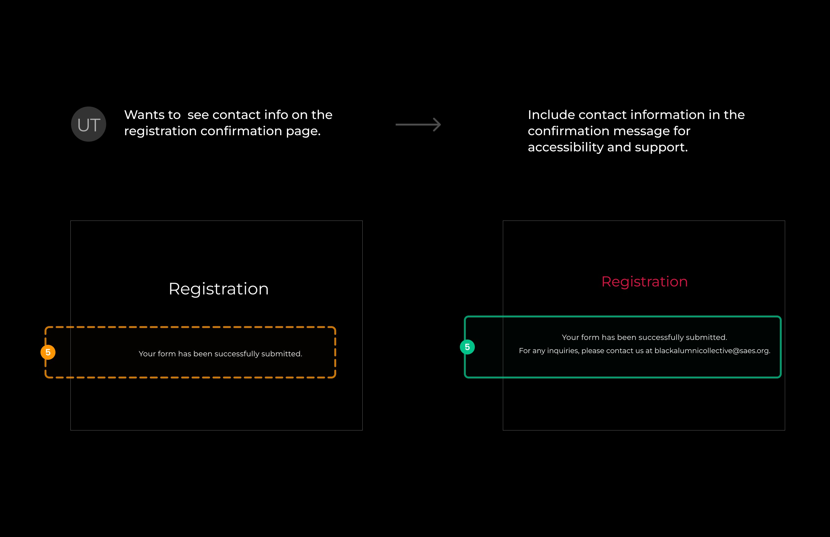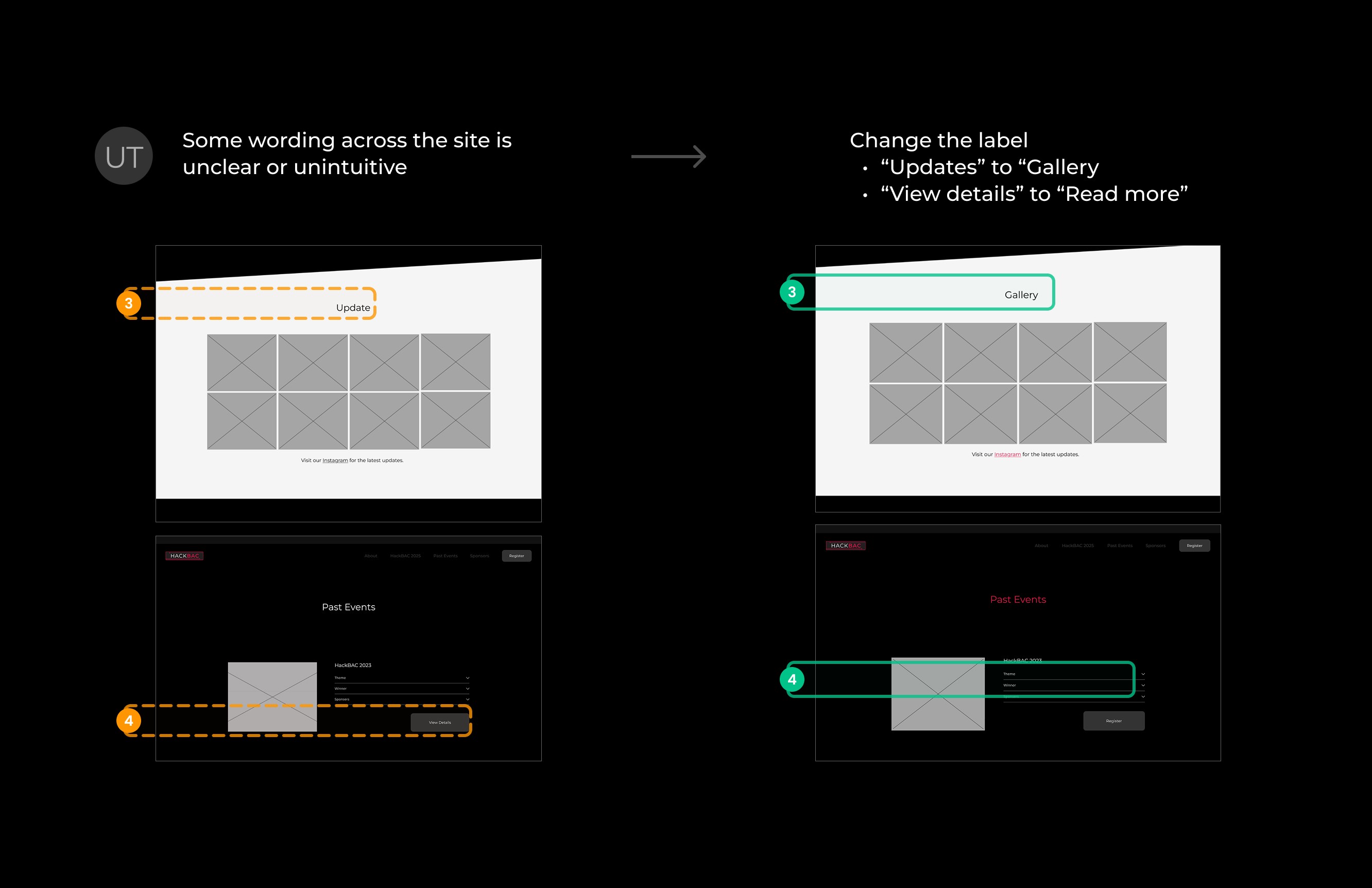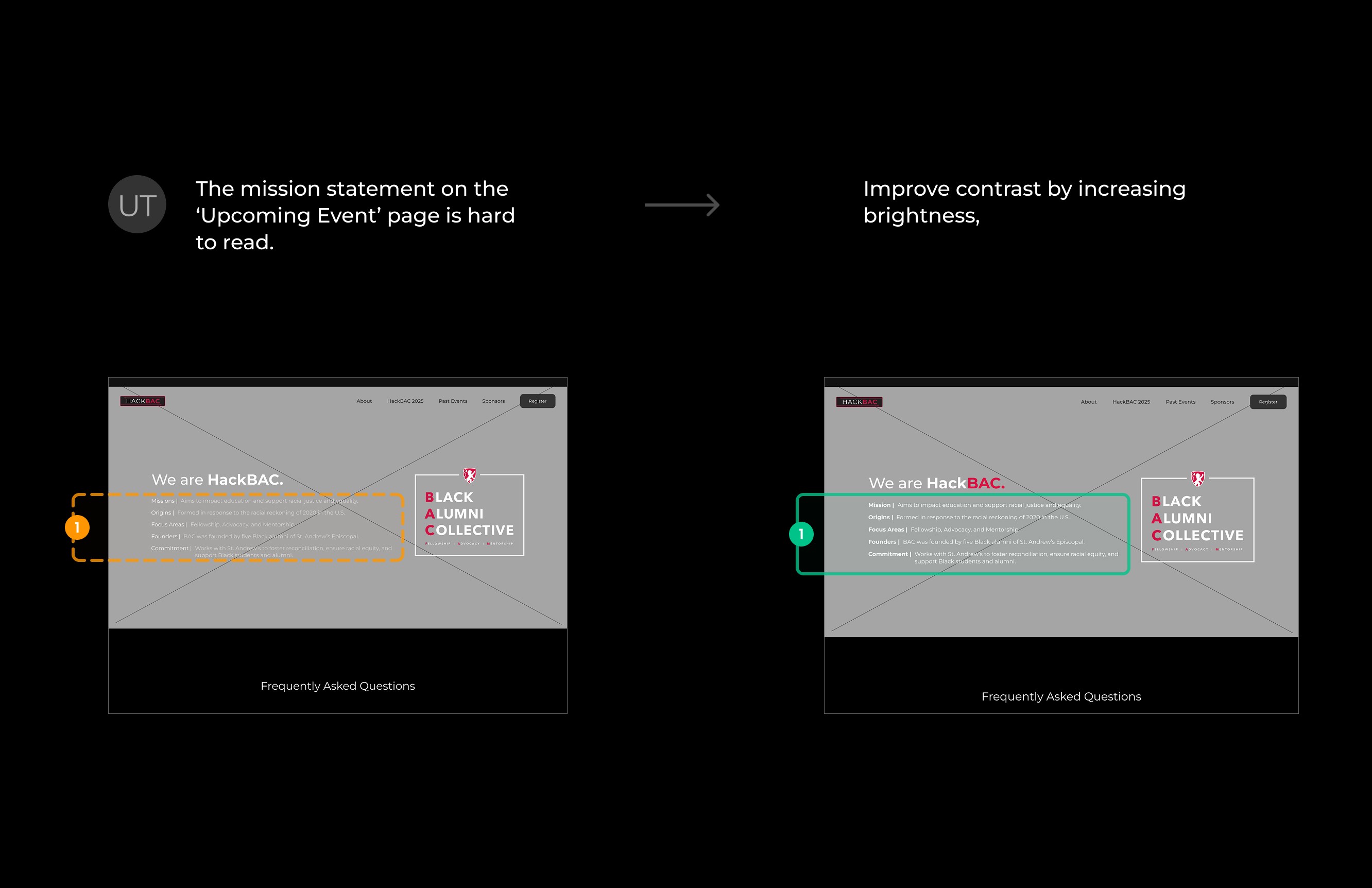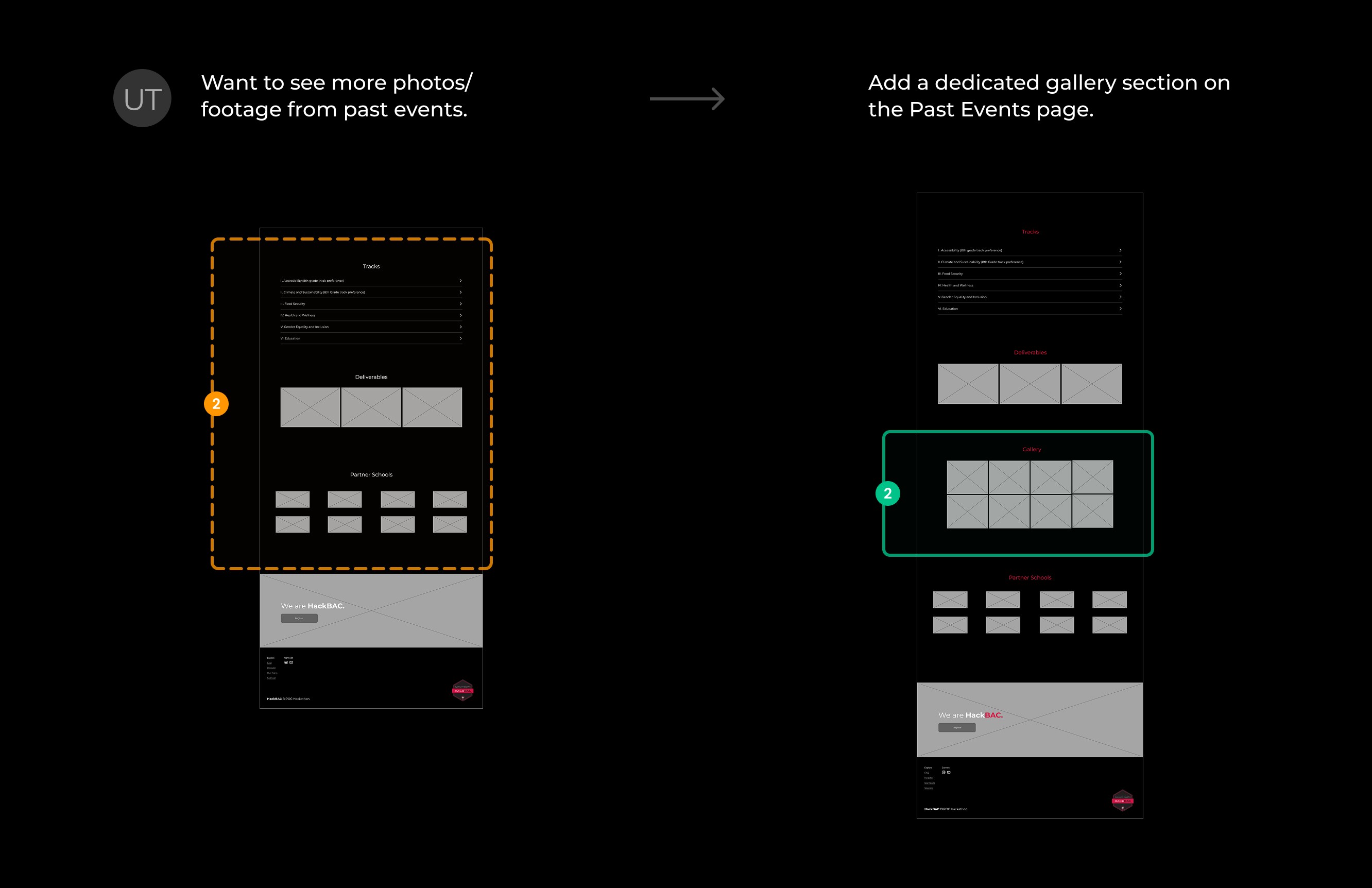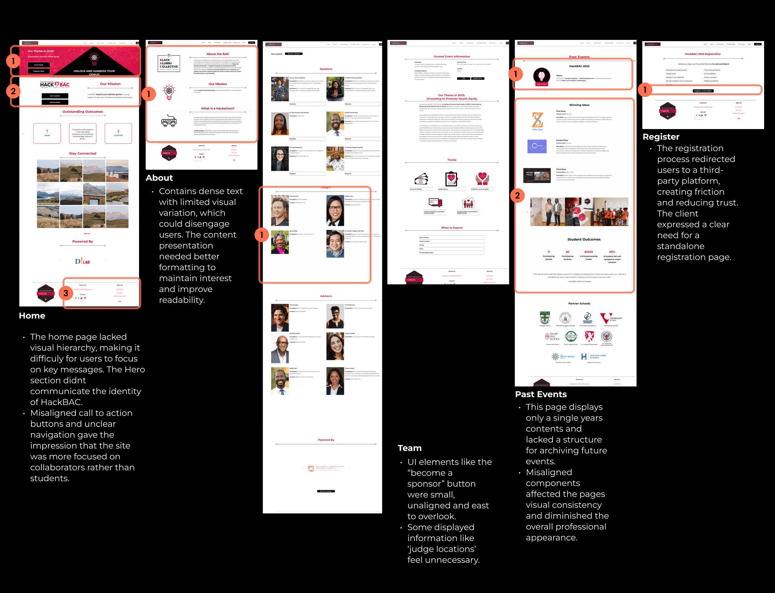 These findings led to several clear design opportunities: prominently showcasing HackBAC’s mission and past success stories, surfacing essential logistics early (such as event details, cost, and eligibility), improving the registration experience with a clearer call-to-action and integrated form, and using visual storytelling, through photos, testimonials, and student projects, to quickly establish trust and generate interest.
