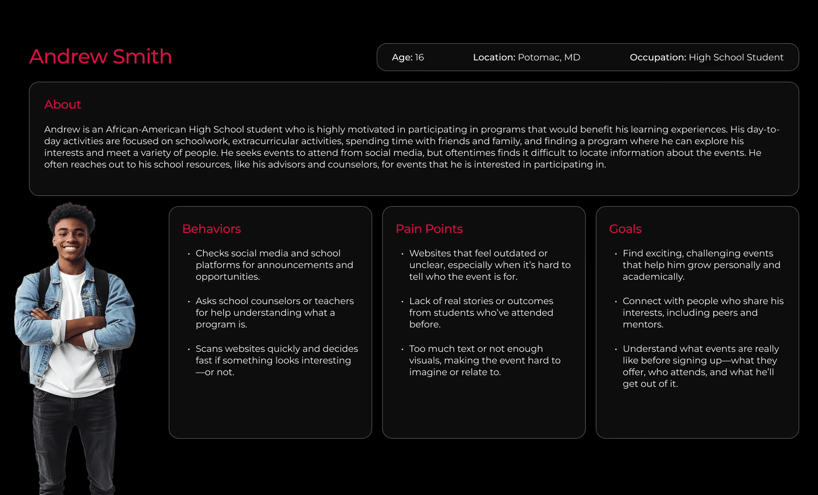Based on our research, we developed two key personas: Samantha, a DEI coordinator who wants to provide meaningful experiences for her students but needs clear, credible information before recommending programs; and Andrew, a curious and motivated high school student who seeks engaging opportunities but often struggles to find or access the right information.
