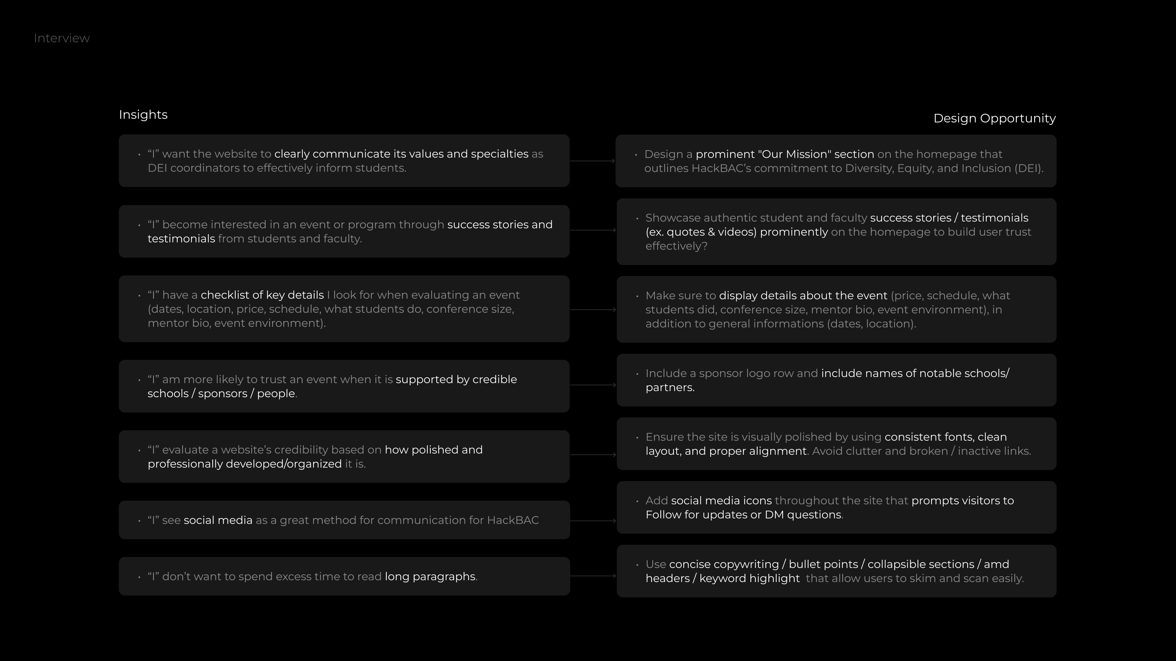 Once we received contact information for key stakeholders, we conducted interviews to better understand how users discover programs like HackBAC, what information they prioritize, and the challenges they face during decision-making and registration.