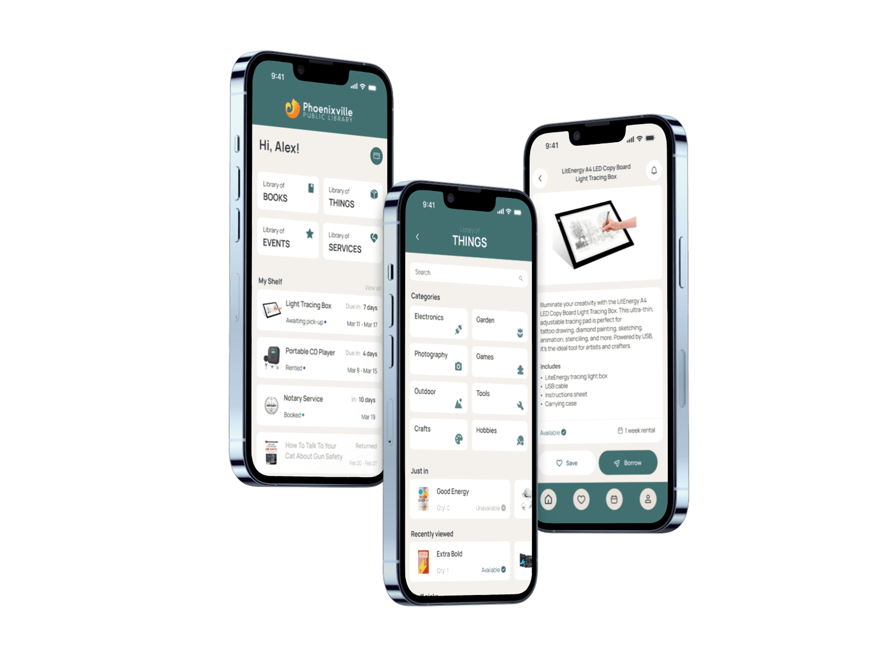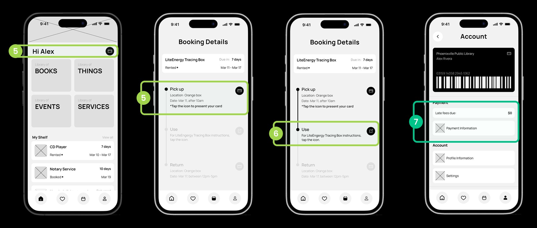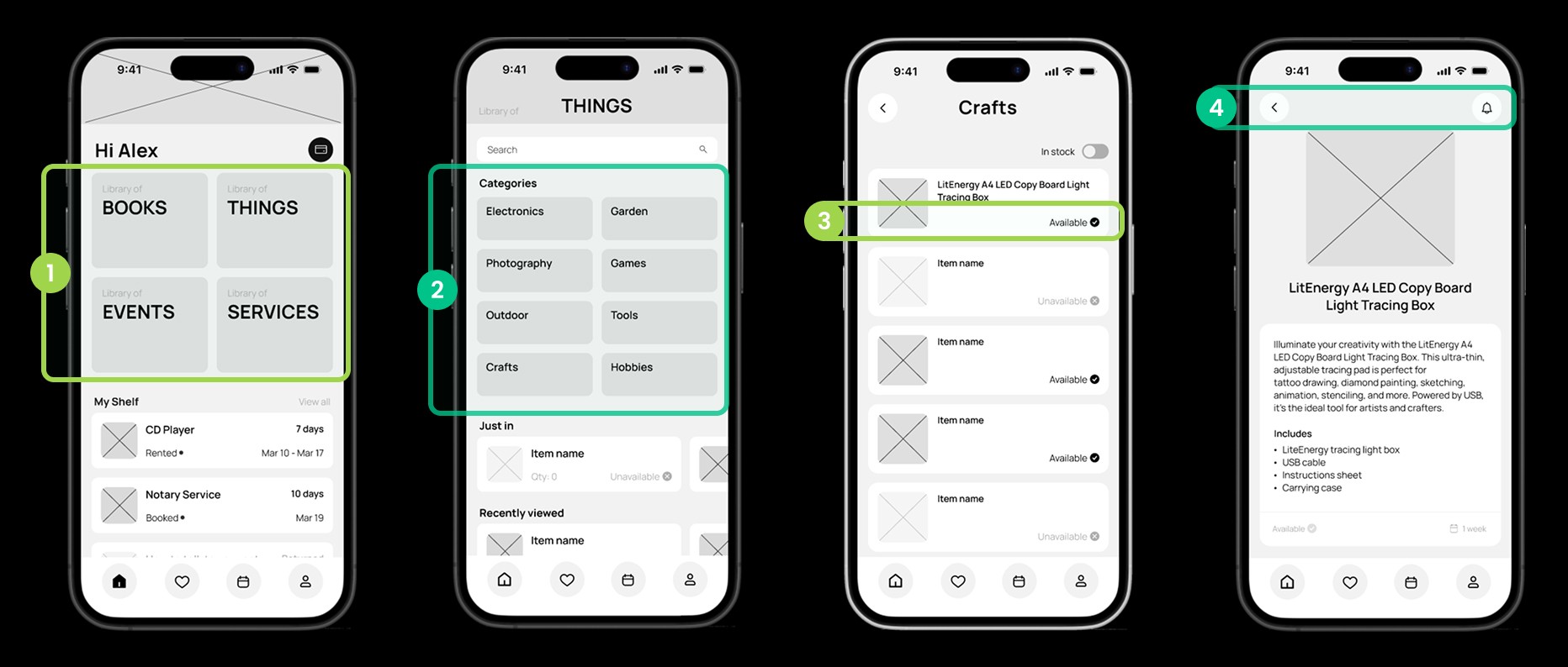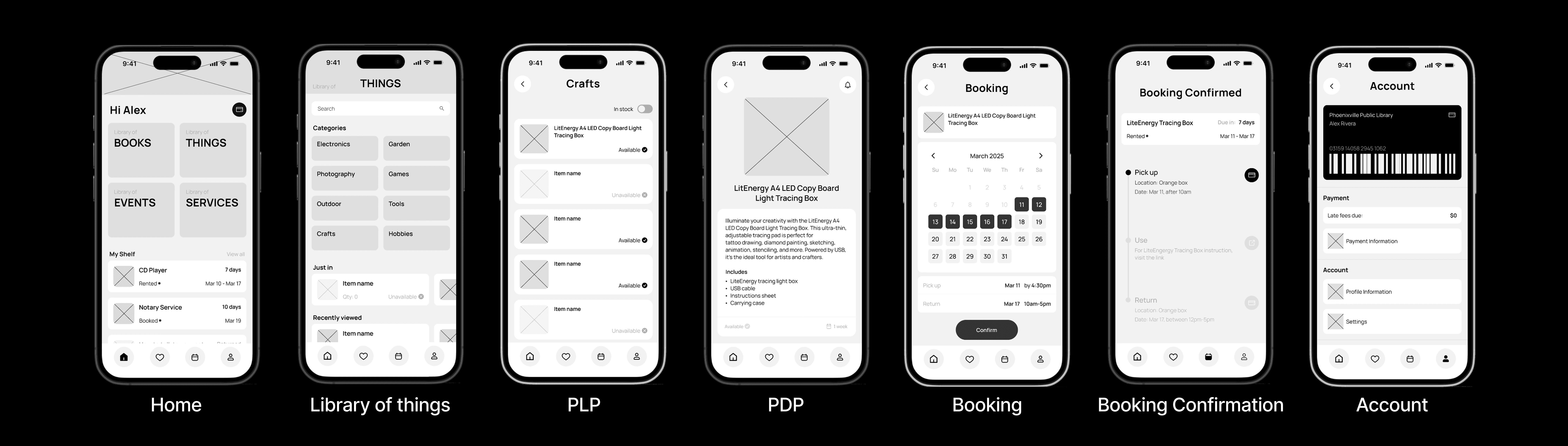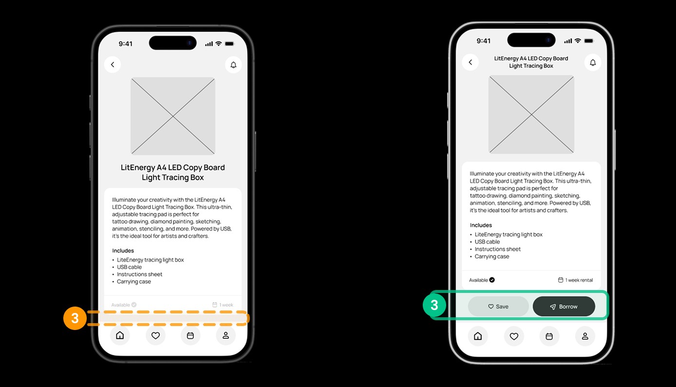 Using these initial wireframes, we conducted five usability tests, asking participants to: find and borrow a “Light tracing box” using the app.
