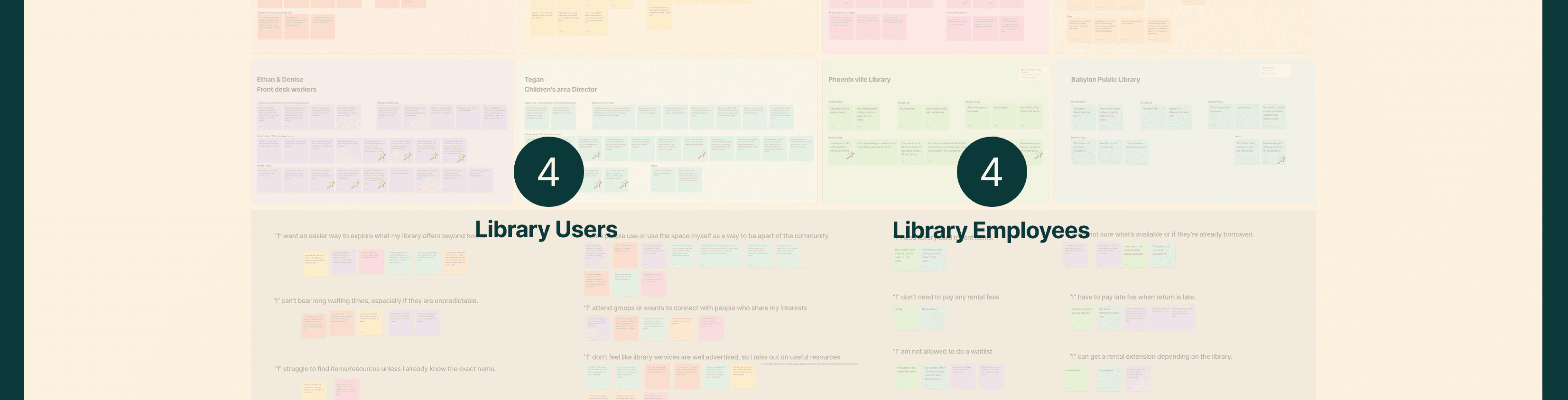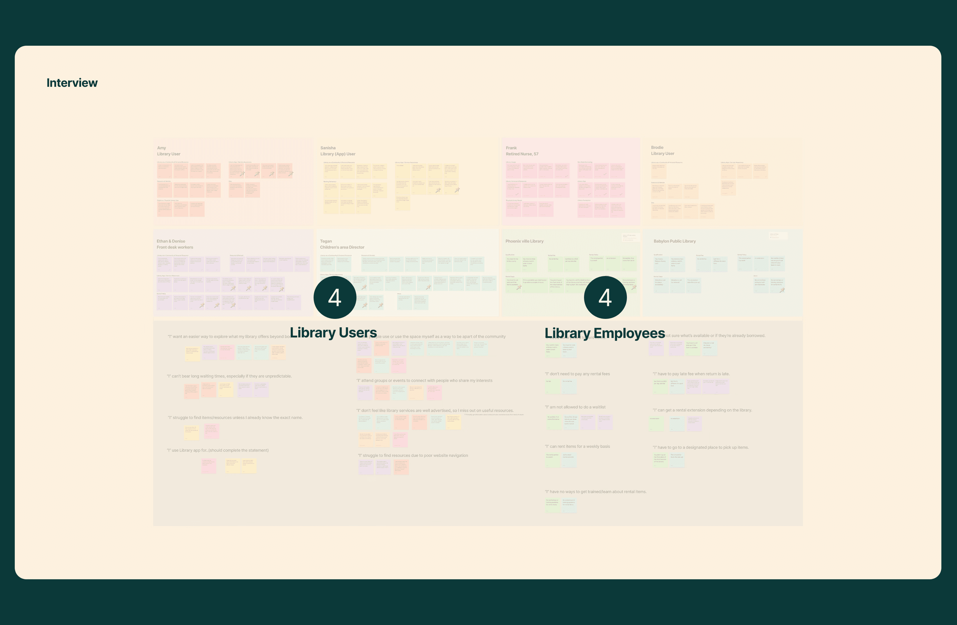 In total we got 8 interviews, 4 from library employees and 4 from actual library users. After transcribing, and organizing all the statements into an Affinity map.
