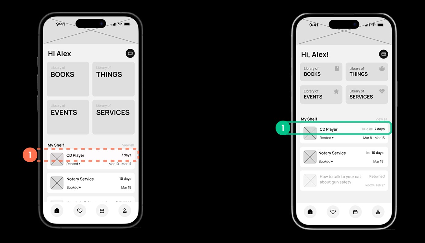 First, on the Home Page, users were confused about the “days” displayed in the right corner of “Recently borrowed Item section.”