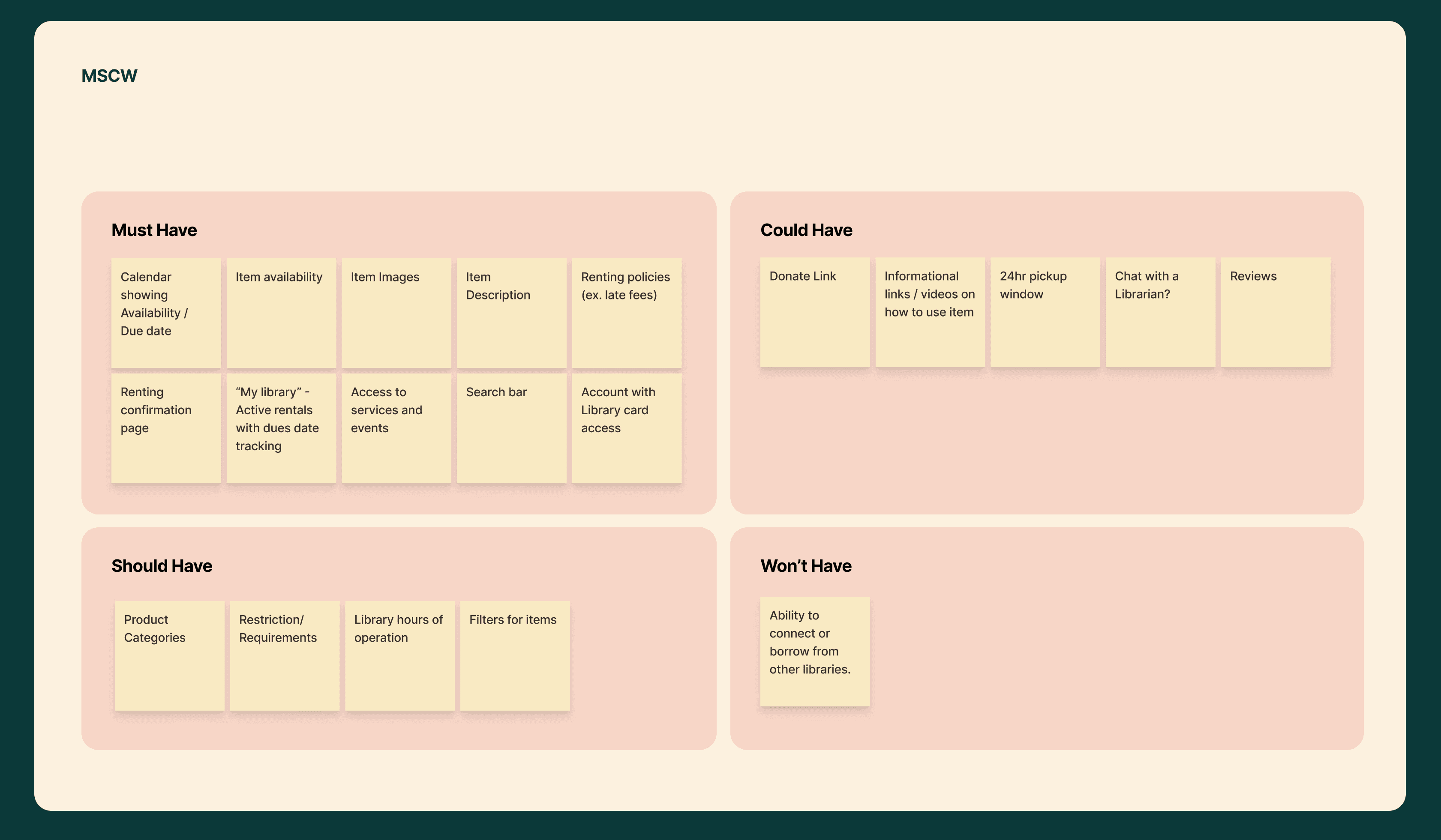 To continue the momentum as a team we wanted to go through a MSCW using a feature inventory supplemented from the duo that took on our comp analysis' and what we learned from the people of the world.