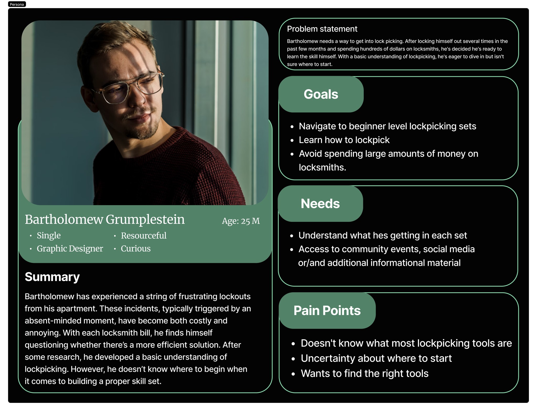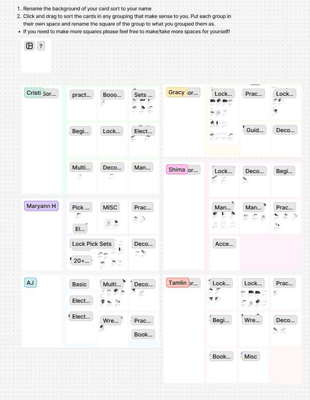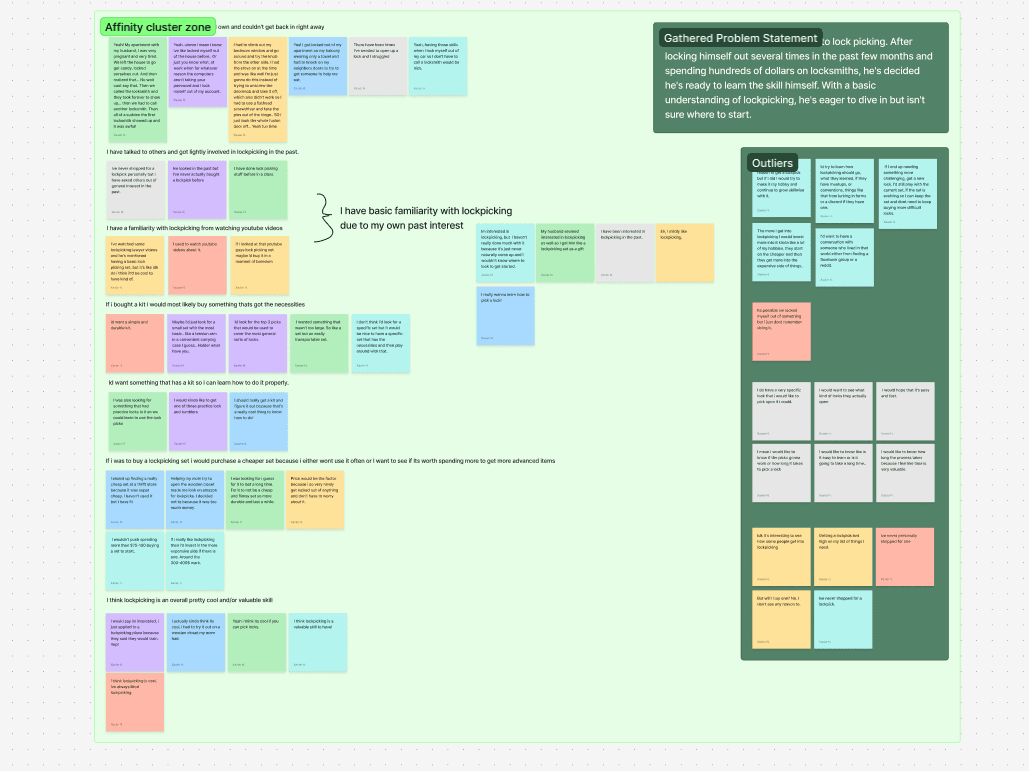 User research proved to be a challenging aspect of the project. Many interview participants had only basic familiarity with lock-picking or no experience at all. Early interviews lacked deep insights, prompting a refinement of the questioning approach. My key take aways were: