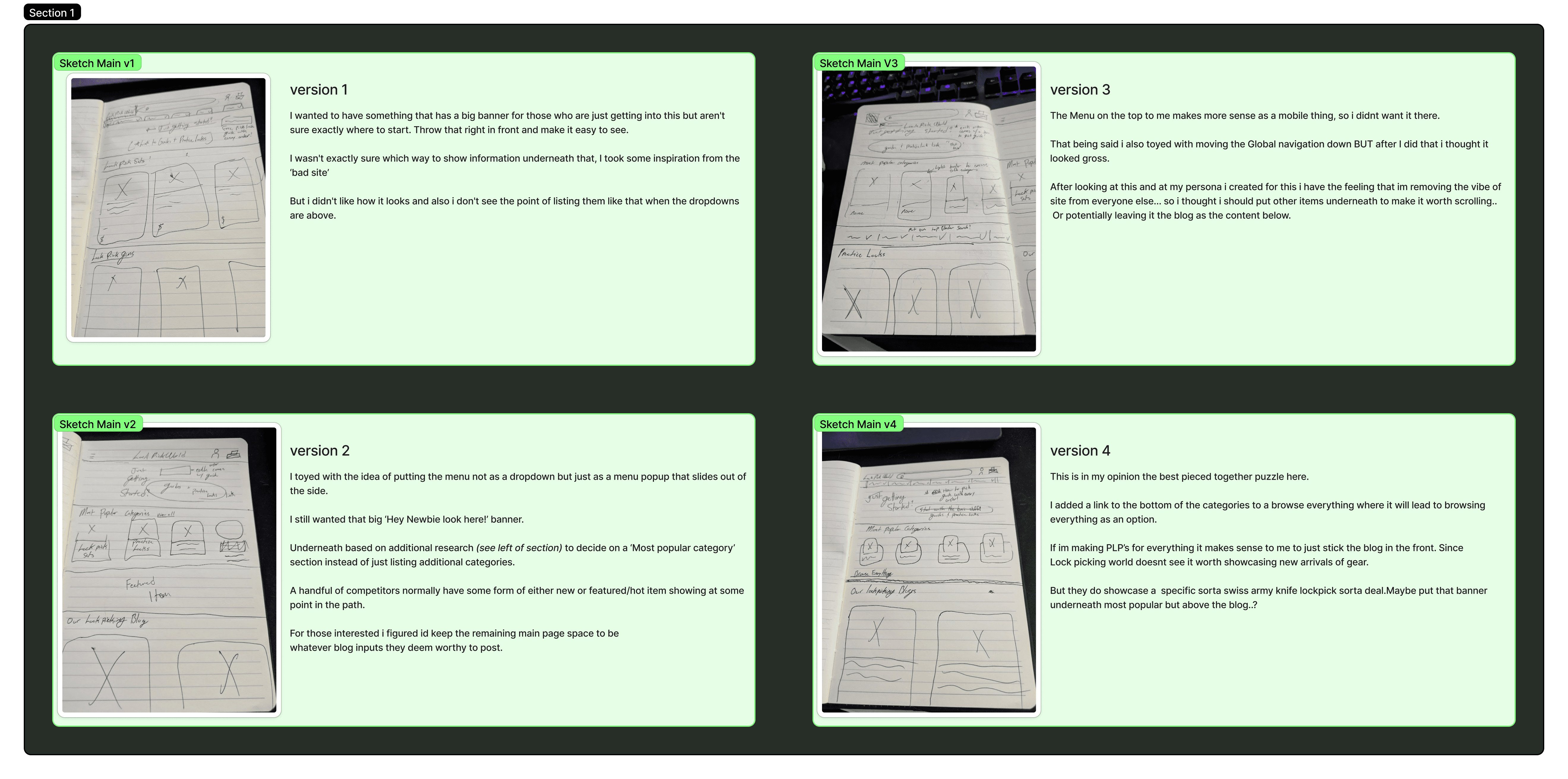 Based on my user research, I aimed to create a more welcoming experience for newcomers by featuring a prominent top banner with a direct link to a Product Listing Page (PLP) showcasing the top 10 recommendations. The original site attempted this, but its unclear wording and unusual guide presentation for beginners only added to the confusion. As I developed my sketches, I frequently revisited insights from Mr. Grumplestein and my user research to steer the design back on course. In the end, I shifted the page’s focus to the blog, which hides a wealth of resources and articles for users who want to explore further.